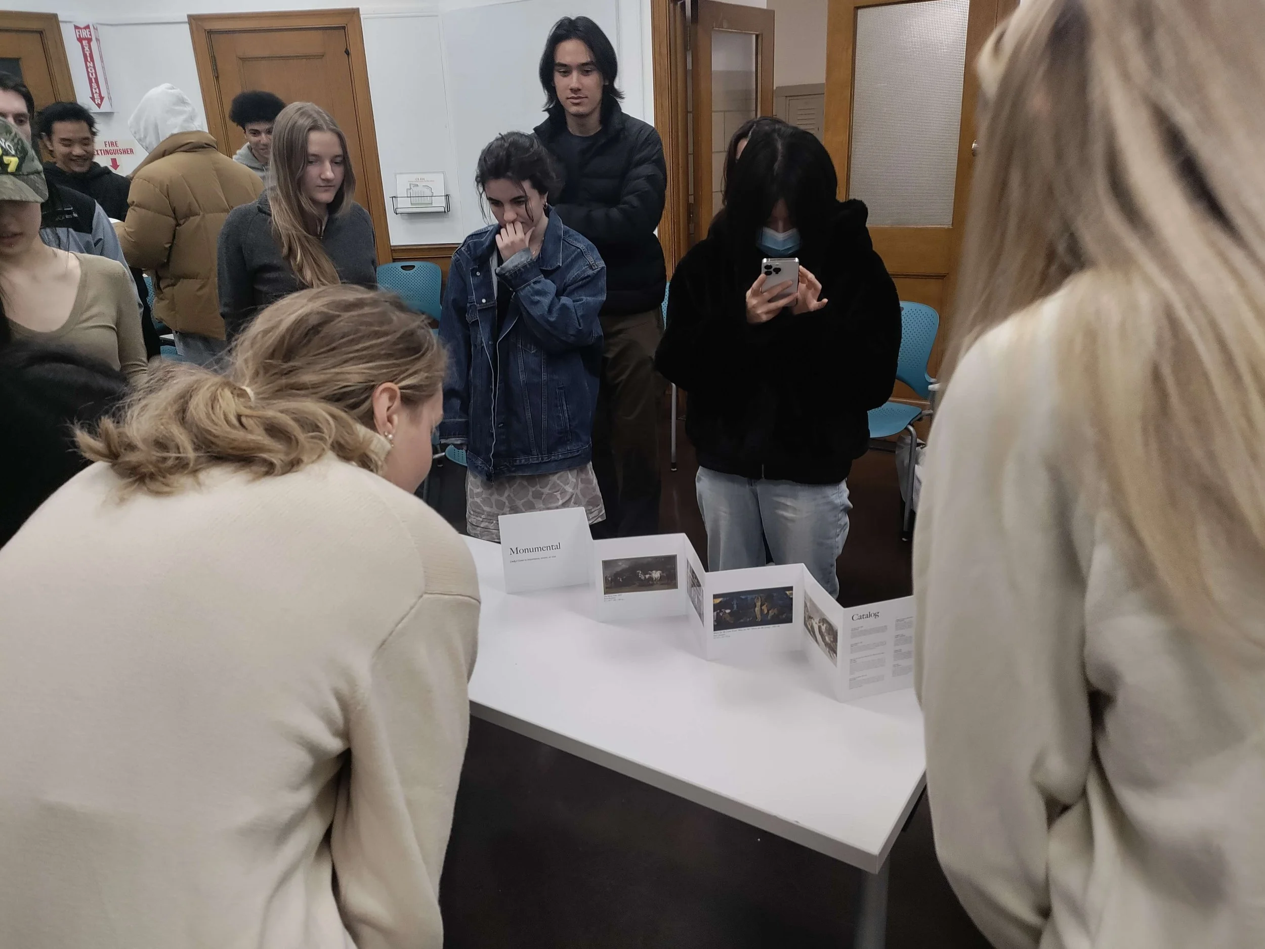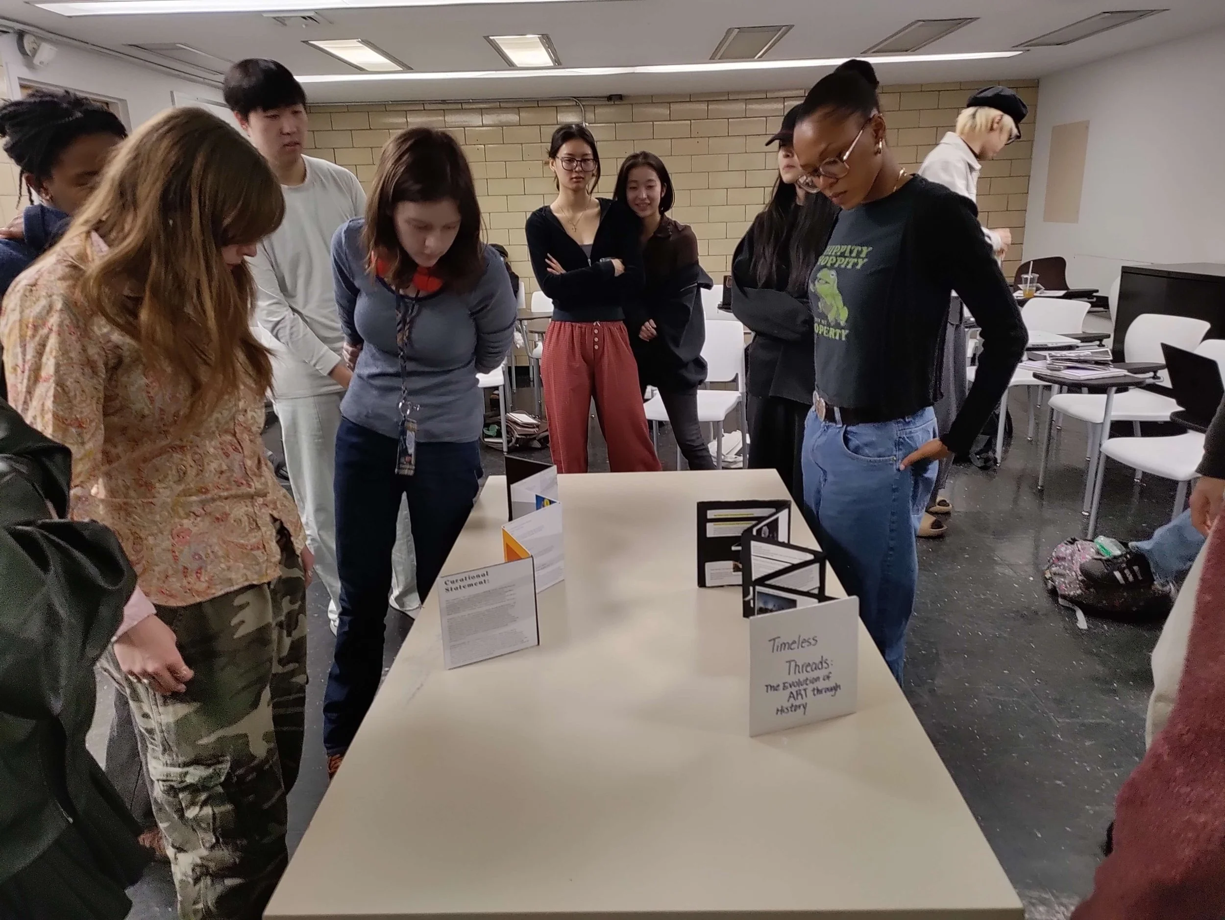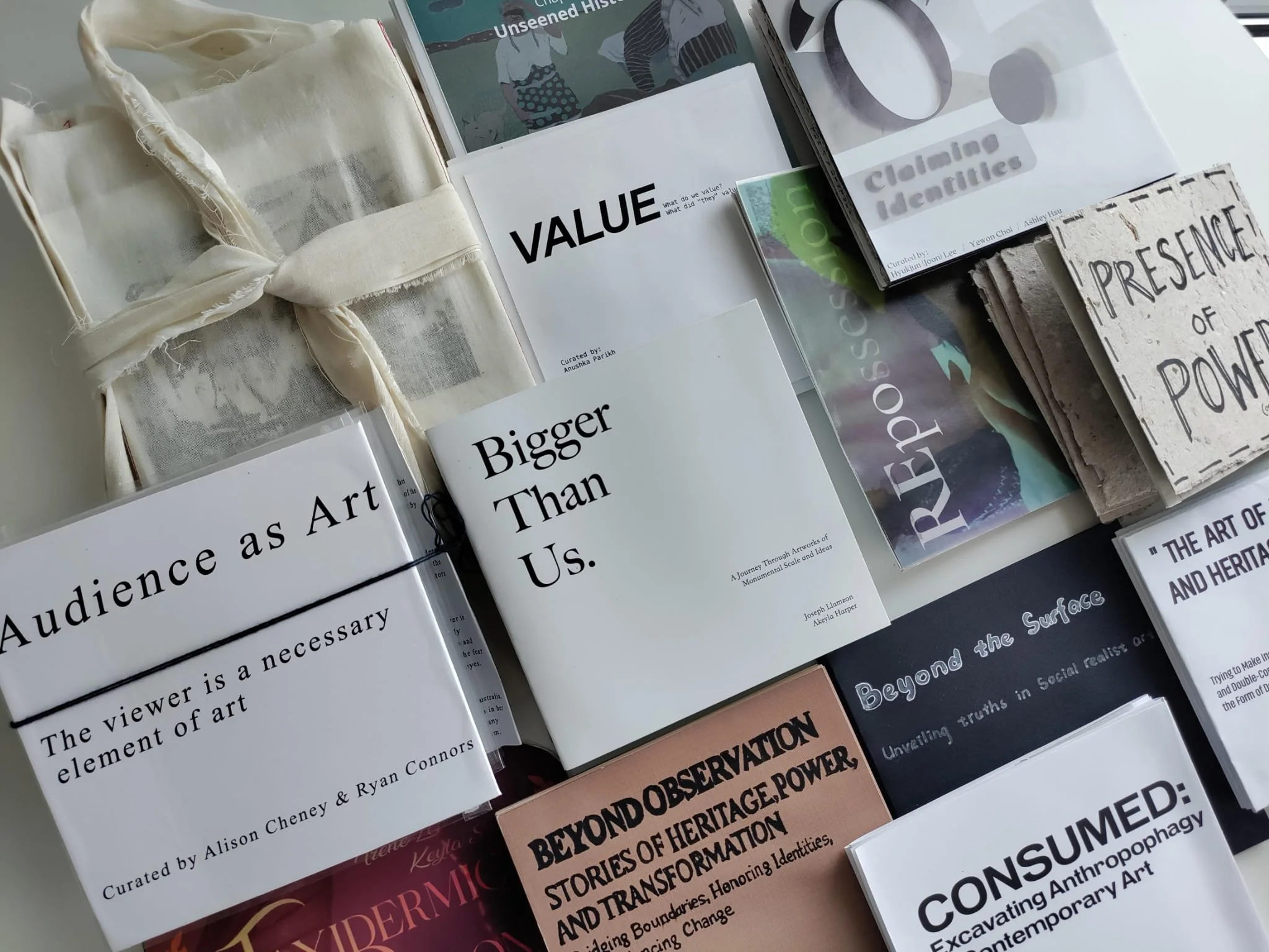 In their final assignment, students worked individually or in groups of 2-3 to produce an “exhibition” curating their own selection of artwork from among the many examples they’ve encountered throughout the lectures. Their exhibitions were presented in the form of accordion booklets and had to feature a theme, title and curatorial note along with an object catalog. The assignment was designed as a way to synthesize their understanding of concepts throughout the course and then present it through their own unique thematic lens.
