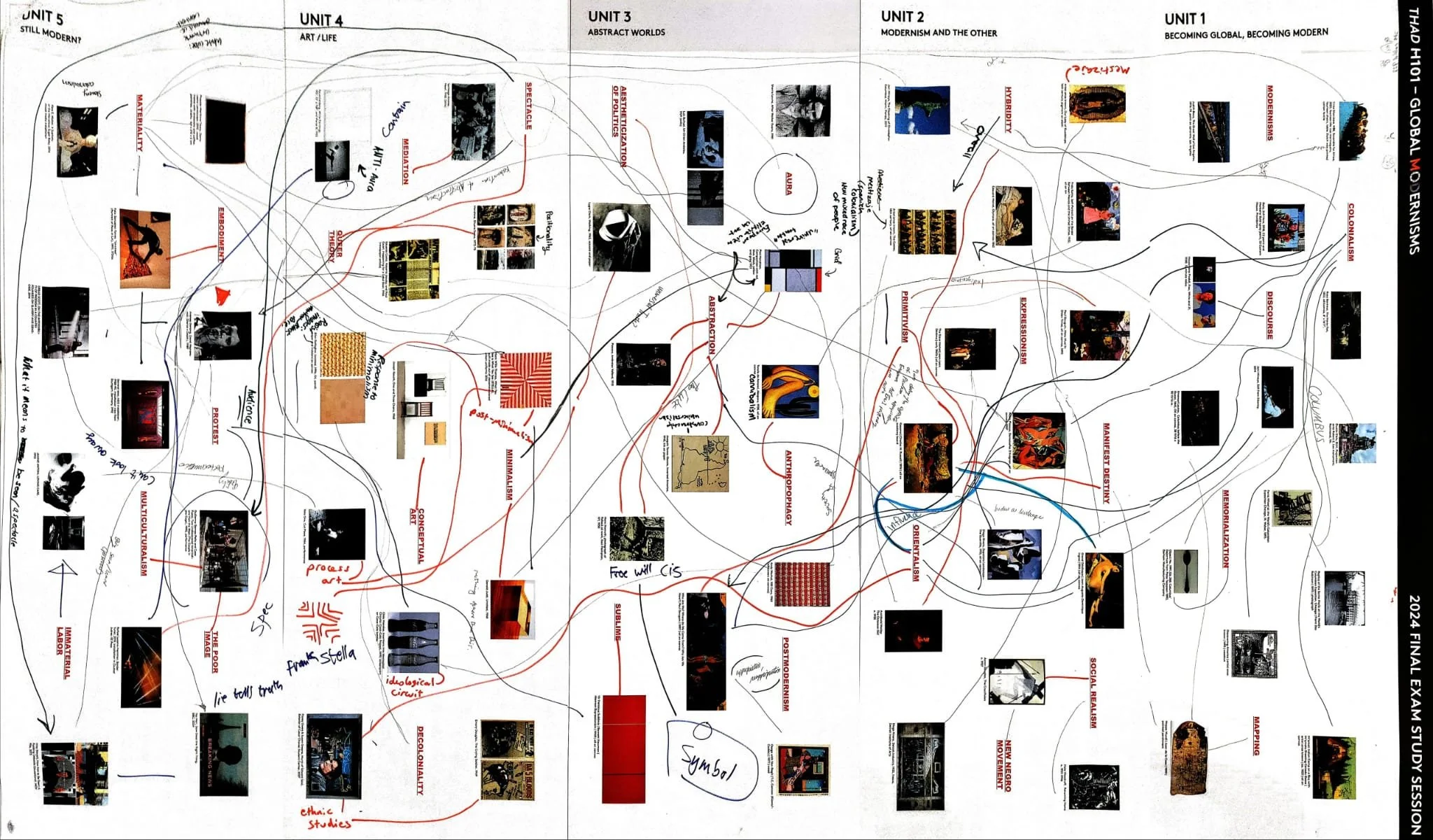Prescribed by overarching course syllabus • The course also featured monthly quizzes and a final exam that tested students on course concepts and their ability to draw thematic connections between artworks introduced to them during the lectures. I was also involved in running two study sessions for the department to help students across sections prepare for the quizzes and final exam. The study sessions involved short hands-on exercises that helped students make connections between keywords and artworks from the lectures.